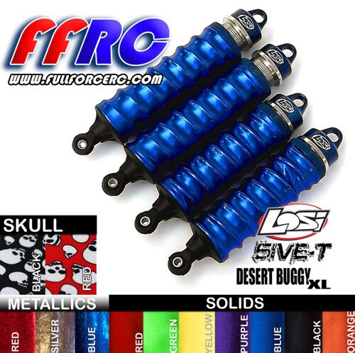 Losi 5ive-T & Desert Buggy XL custom sized shock boots are here! Our shock boots are designed to cover up your shocks and keep out unwanted dirt and debris. Made from high quality lycra fabric which make our shock boots extremely durable. Our special triple stitch method guarantees that our stitching will hold up and as an added bonus allows you to cut them to size without any problems! We are offering these in complete sets of four (front and rear). Very simple install, simply slide over your springs, tuck the ends in, and put your springs back on. That's it! Something so simple can save you a load of money by protecting your shocks! Each pack comes with four shock boots in your choice of color to do one full truck. Each pack comes with four shock boots to do one full truck. Check out the install of these shock boots here. Fits the Losi 5ive-T & Losi Desert Buggy XL. Also fits the DBXL K&N truck and the new Desert Buggy XL-E!