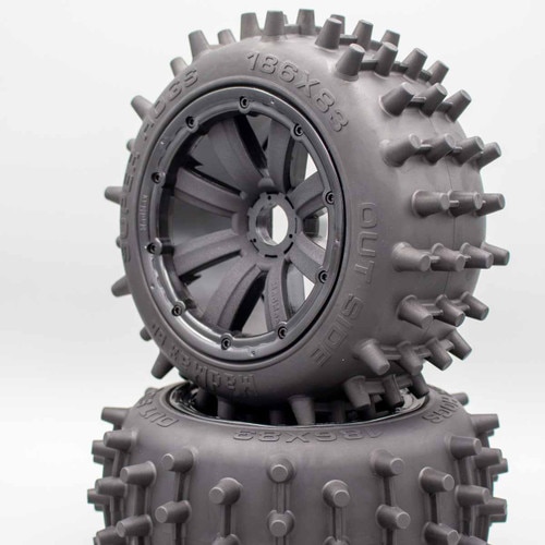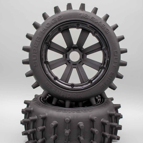 Now available at DDM is the MadMax Super Hogs tire set. These are sold in PAIRS. This is the "REAR" Wide size. They are sold assembled as shown in the photos. The tires feature extra tall spiked knobs in alternating three and four spike rows. In between the spikes is a reinforcing rib that allows for extra durability and keeps the pins from folding over. The extra aggressive design is ideal for grass fields and sand. They also work well with extremely loose and loamy style dirt. Designed for use with high power applications these work great in electric brushless and gas models.