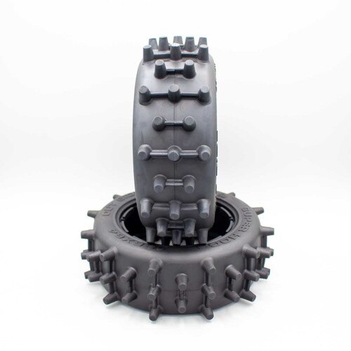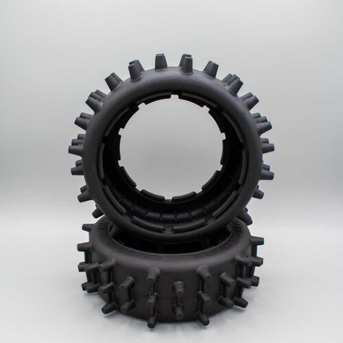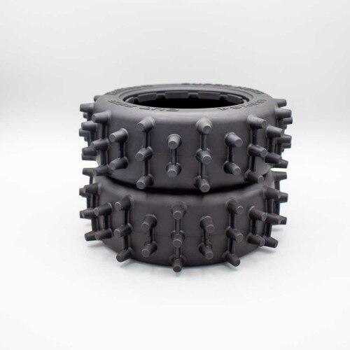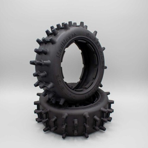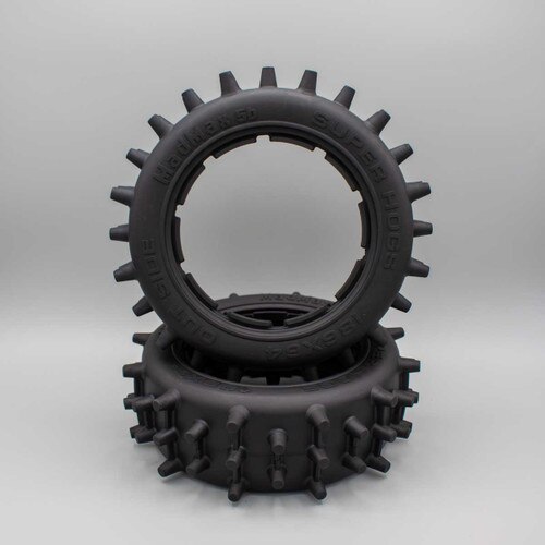 Now available at DDM is the MadMax Super Hogs tire set. These are sold in PAIRS. This is the "Front" Narrow size. The tires feature extra tall spiked knobs in alternating two and three spike rows. In between the spikes is a reinforcing rib that allows for extra durability and keeps the pins from folding over. The extra aggressive design is ideal for grass fields and sand. They also work well with extremely loose and loamy style dirt. Designed for use with high power applications these work great in electric brushless and gas models.