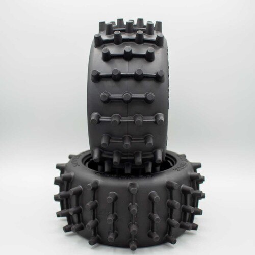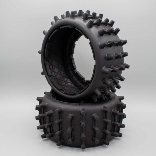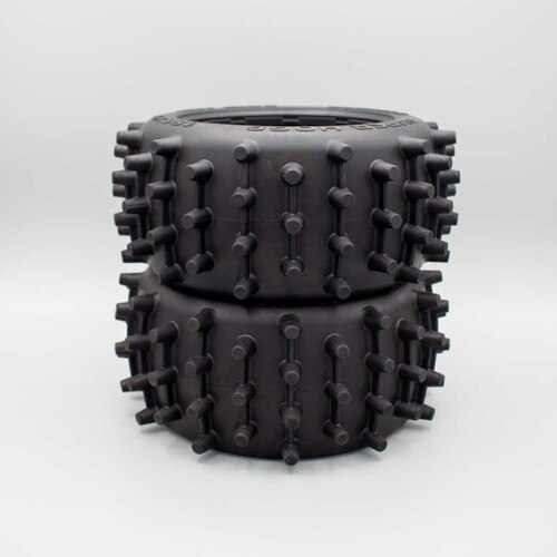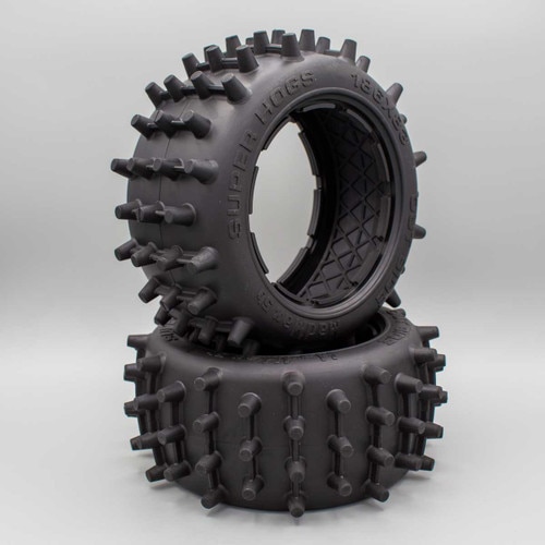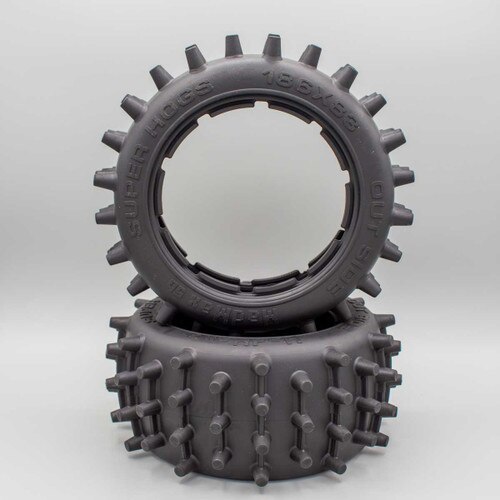 Now available at DDM is the MadMax Super Hogs tire set. These are sold in PAIRS. This is the "REAR" Wide size. The tires feature extra tall spiked knobs in alternating three and four spike rows. In between the spikes is a reinforcing rib that allows for extra durability and keeps the pins from folding over. The extra aggressive design is ideal for grass fields and sand. They also work well with extremely loose and loamy style dirt. Designed for use with high power applications these work great in electric brushless and gas models.