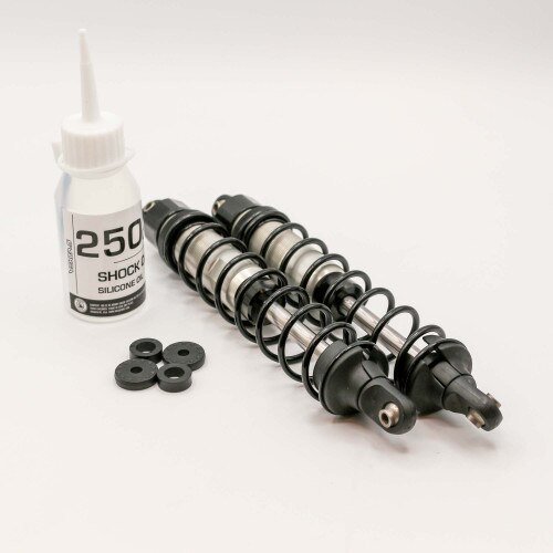 Each shock set comes pre-assembled and ready for oil to be added. For convenience a bottle of silicone shock fluid is included as well as a spare set of shock pistons that you can custom drill your own holes in for fine tuning. Replacement parts including shafts and shock rebuild sets are available separately.